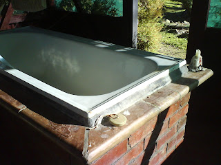 pigs, Peter has built a wood-fired hot-tub out of brick and a reclaimed cast-iron bathtub. Fresh dam water is used, the color of weak herbal tea from being seeped with eucaplytus tannins. A chimney pipes out all the smoke from the fire, and a very high-tech system of pulling the plug to drain water while turning the tap to let in more cold water is used by the bather to regulate the temperature and prevent themselves from becoming boiled soup.
